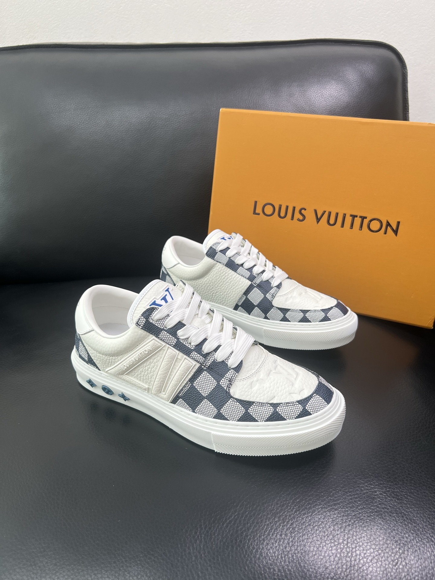 這雙 LV 高仿休閒鞋以藍白 Damier 棋盤格為主視覺,搭配柔軟白牛皮,清爽大方,特別適合日常穿搭。鞋面做工細緻,對標正品細節,鞋側的壓印 LOGO 與鞋底星星花紋設計增添辨識度。鞋墊採用柔軟材質,長時間穿著依然舒適,不磨腳。整體鞋型流暢百搭,搭配牛仔褲、運動褲甚至休閒短褲,都能展現年輕率性的時尚風格。多位買家反饋,這雙高仿鞋舒適感與原版相近,質感優秀。