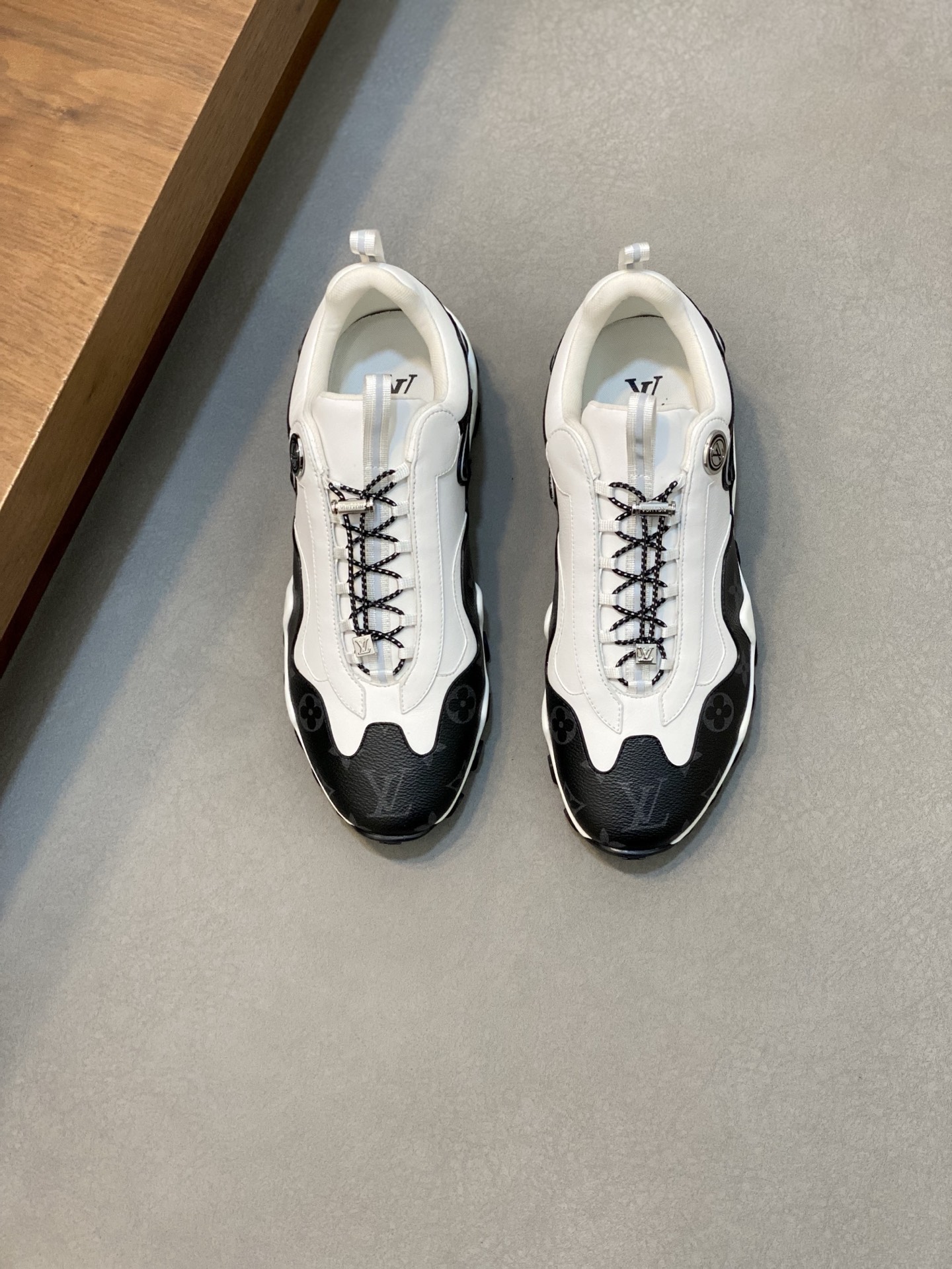 這雙LV A貨運動鞋以黑白拼色為主題,線條流暢,時尚感鮮明。鞋面採用細緻皮革搭配網布拼接,兼顧耐用與透氣。鞋頭低調壓印經典花紋,點綴品牌標誌元素。鞋底厚實穩固,防滑耐磨,適合都市日常與潮流穿搭。實際上腳回饋輕盈舒適,不論是運動或休閒皆可輕鬆駕馭。