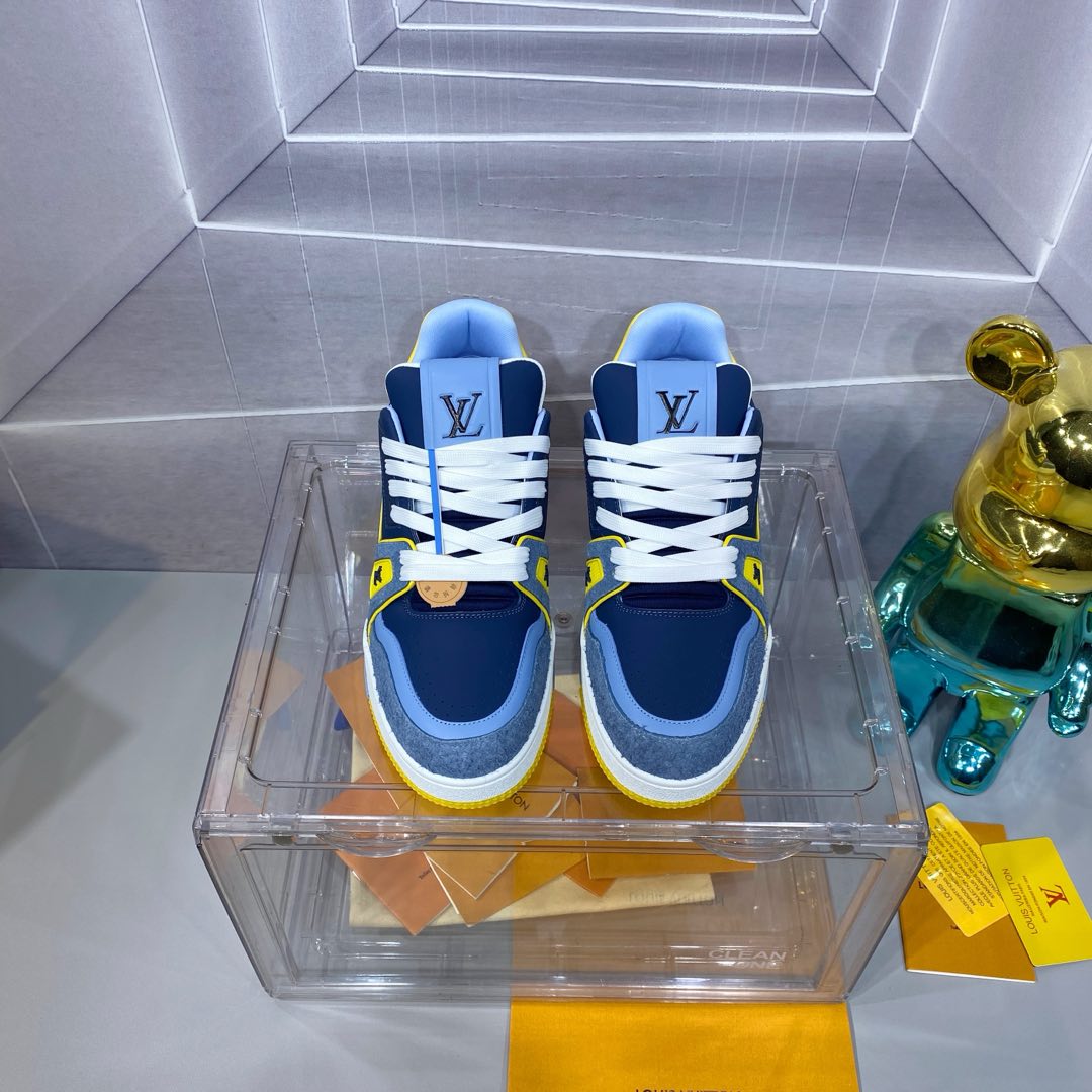這款LV 高仿男士運動鞋以深藍與淺藍拼色設計,搭配亮黃色細節與白色鞋帶,營造青春活力的氛圍。鞋舌綴有經典品牌Logo,鞋底厚實耐穿,行走間穩定舒適。顧客評價「顏色搭配清爽亮眼,無論搭配牛仔褲還是休閒短褲,都能凸顯時尚感」。高仿版本在細節與質感上高度還原專櫃設計,適合追求獨特配色與潮流感的消費者。
