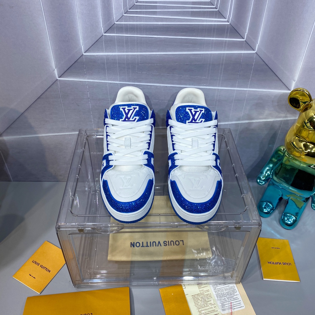 這款LV 一比一 Trainer 運動鞋以藍白撞色設計,鞋身鑲嵌細緻鑽飾,呈現出極高的辨識度與奢華感。鞋側經典Monogram壓紋與厚底設計相呼應,無論搭配牛仔或運動休閒都能展現強烈時尚感。實際穿搭回饋「舒適度超乎預期,鞋身亮點在燈光下格外搶眼」,一比一版本在做工與材質上完整對標正品,值得入手。
