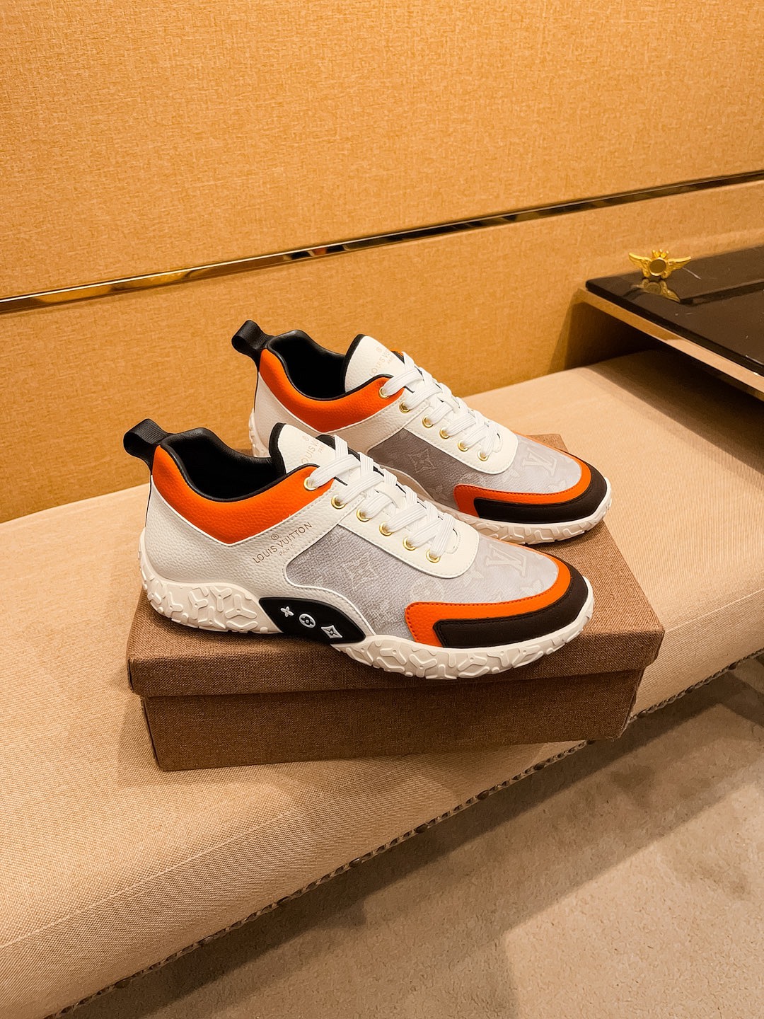 這款 LV 精品仿製灰白橘拼色運動鞋,以鮮明的橘色點綴灰白主調,營造出動感與時尚兼具的氛圍。鞋面材質柔軟細膩,搭配經典 Monogram 暗紋細節,質感滿分。鞋底設計採用耐磨橡膠,提供舒適緩震效果,長時間行走依然輕盈不累。許多顧客回饋,這雙鞋無論搭配牛仔褲或休閒運動風格,都能瞬間提升整體造型亮點。