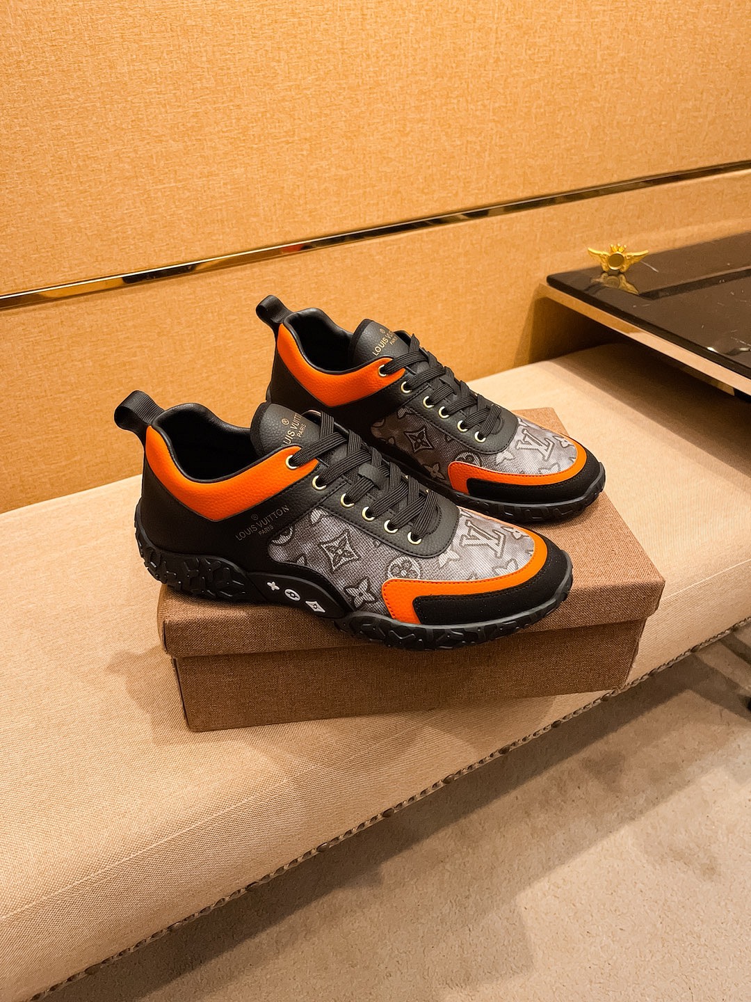 這款 LV 高仿黑灰橘拼色運動鞋,以沉穩的黑灰色調為基礎,搭配鮮明橘色點綴,展現低調卻不失活力的時尚氛圍。鞋面選用細膩材質,並搭配經典 Monogram 壓紋,呈現質感細節。鞋底設計輕盈耐磨,搭配舒適的內裡襯墊,提供全天候穿著的舒適體驗。顧客反饋這雙鞋無論搭配休閒牛仔或運動褲,都能讓造型更具層次感與潮流氣息。