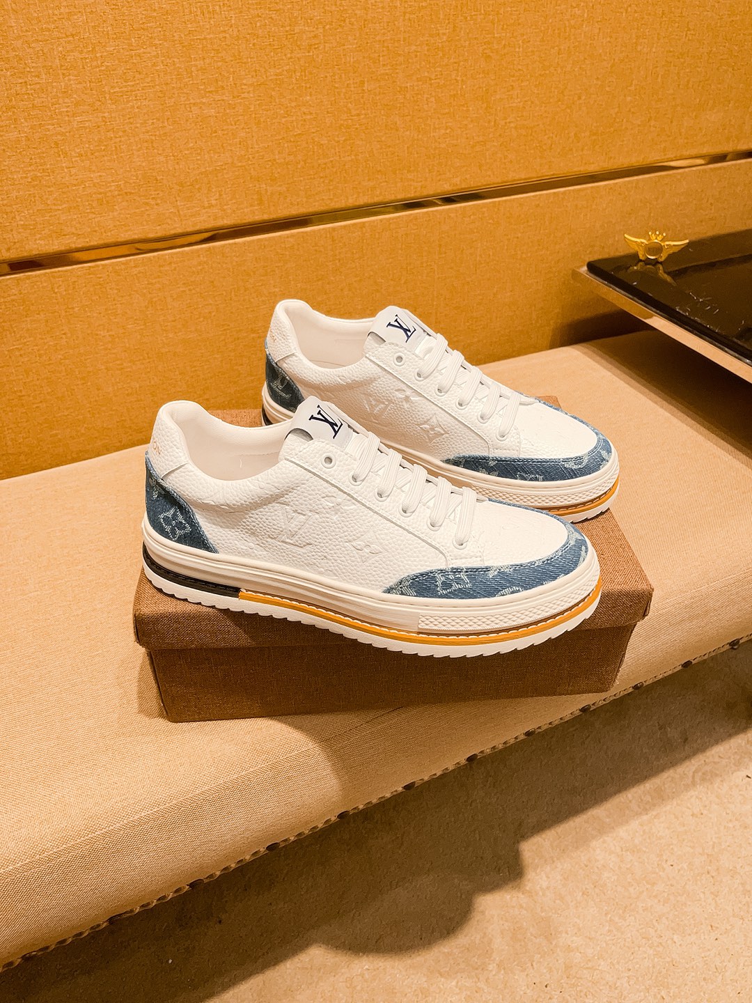 這款 LV 精品仿製白色拼藍牛仔運動鞋,運用細緻壓紋皮革結合經典 Monogram 牛仔布拼接,展現清新又時尚的風格。鞋底設計舒適耐磨,黃色線條點綴增添活力。整體外觀簡約卻不失奢華感,適合日常出街、休閒聚會穿搭。許多顧客反饋此鞋款輕盈舒適,搭配牛仔褲或休閒褲效果極佳,是時尚愛好者的必備單品。