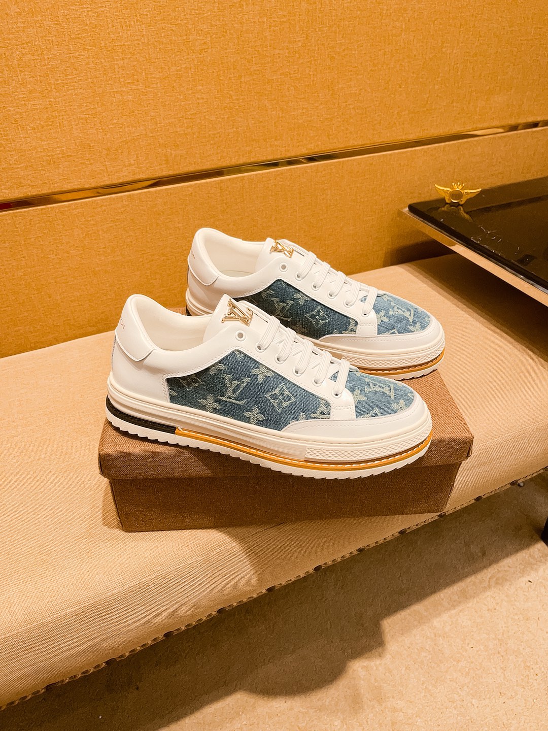這雙 LV 原單藍色丹寧拼接運動鞋,以 Monogram 牛仔布與白色皮革拼接設計,呈現出年輕又休閒的時尚氛圍。低筒鞋型搭配厚實鞋底,不僅穿著舒適,還能拉長腿部比例。鞋側的 LV 經典標誌與丹寧質感巧妙融合,讓它成為日常穿搭的百搭單品。許多顧客反饋質感與細節媲美專櫃,無論搭配牛仔褲或休閒褲都能展現高級氛圍。