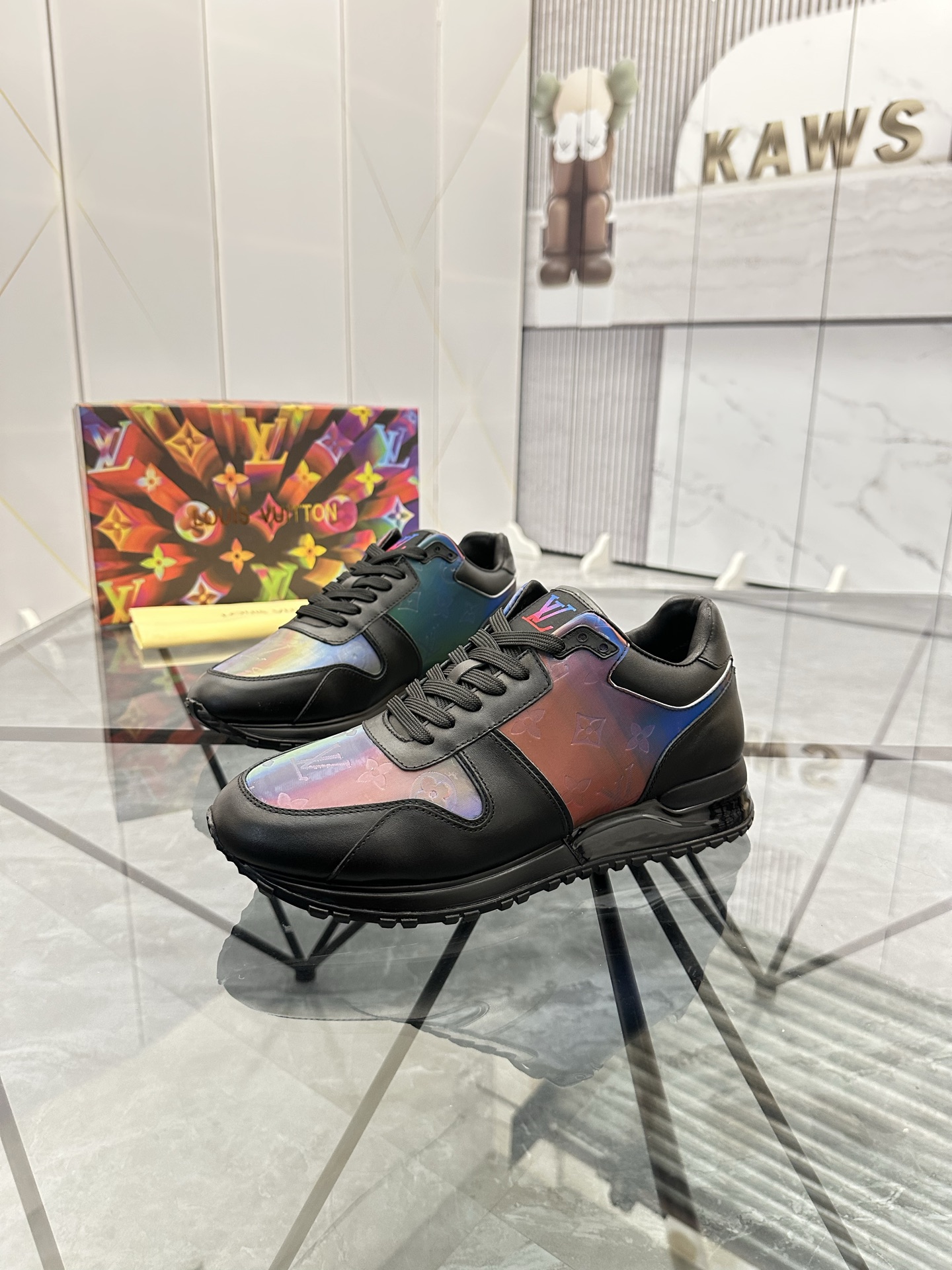 這款 LV 原單彩虹漸變運動鞋,以黑色皮革搭配漸變彩虹色澤,展現獨特的視覺效果。鞋面隱約浮現 Monogram 壓紋細節,低調又不失個性。鞋底選用防滑橡膠設計,具備良好抓地力,行走舒適不易疲勞。顧客實測反饋其質感與原版專櫃高度一致,無論是搭配休閒牛仔還是街頭運動風,都能增添奢華氣場。