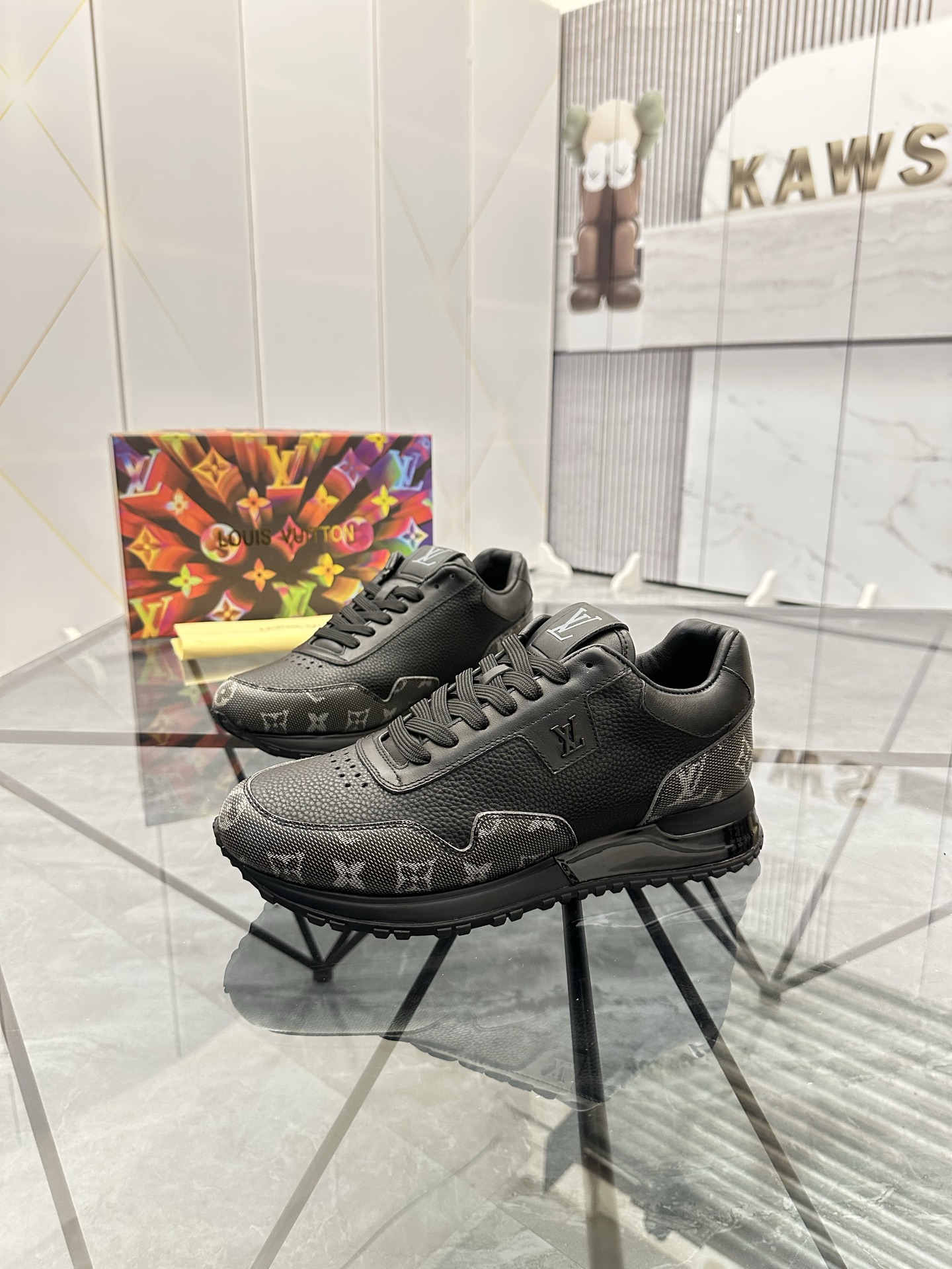這雙 LV 一比一全黑運動鞋,鞋面以荔枝紋皮革結合細緻壓紋拼接,質感沉穩大氣。鞋頭及側身融入經典 Monogram 暗紋設計,低調中透露品牌細節。鞋舌飾以立體 LV 標誌,彰顯獨特品味。橡膠鞋底耐磨防滑,確保日常行走穩定舒適。此款一比一運動鞋不僅能搭配日常牛仔、休閒褲,更能與簡約西裝形成時尚反差,是都市男士衣櫥中不可或缺的單品。