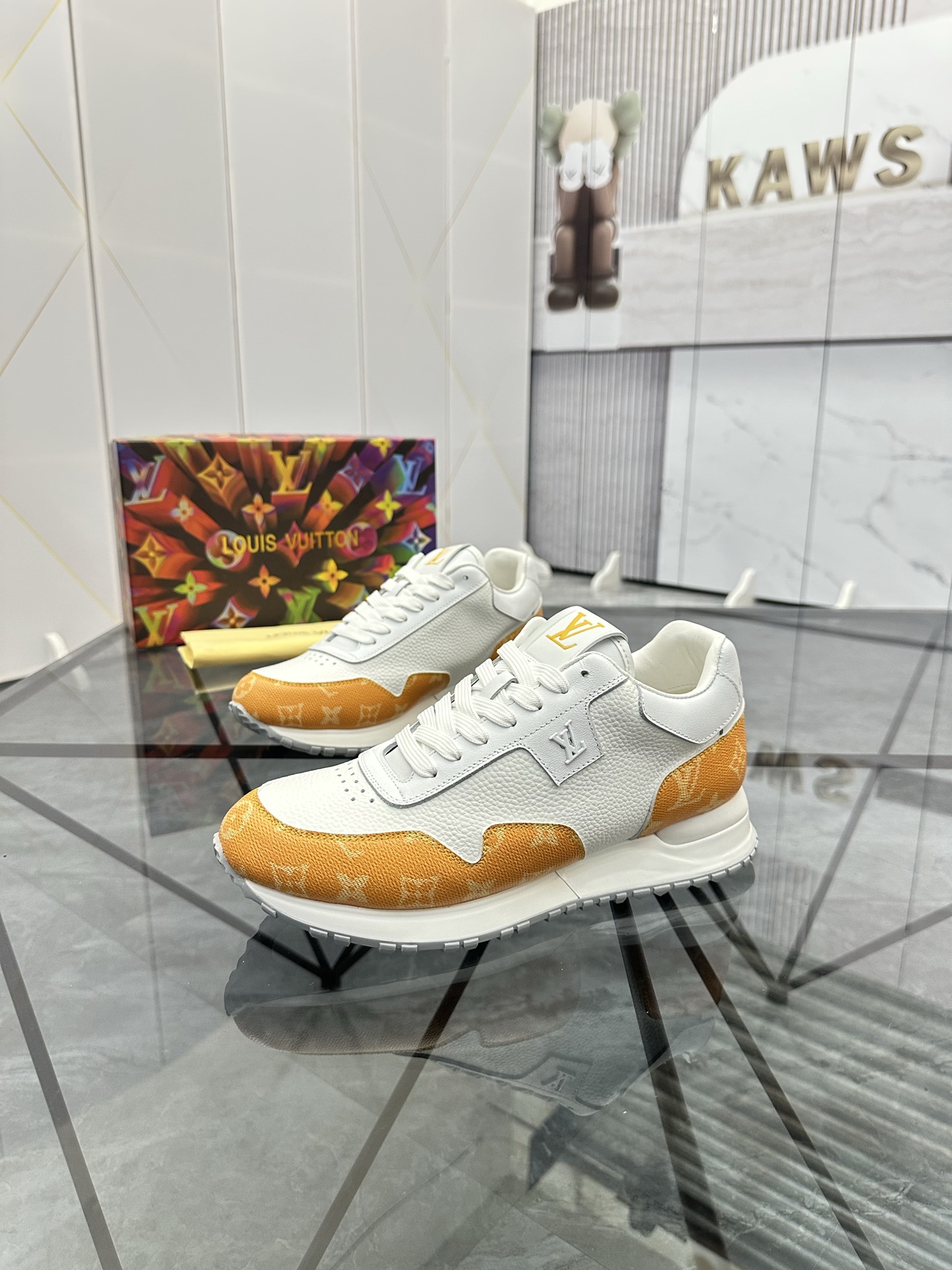 這雙 LV 高仿白橙拼接運動鞋,以荔枝紋皮革搭配亮眼的橙色 Monogram 布料拼接設計,帶來鮮明的視覺效果與時尚氣息。鞋舌印有大膽的 LV 標誌,凸顯品牌辨識度。鞋底選用耐磨橡膠材質,兼具輕盈與穩定支撐,穿著舒適,適合長時間行走或日常出行。整體設計既充滿運動感,又能與休閒裝或街頭穿搭自然融合,為男士造型增添活力與個性。