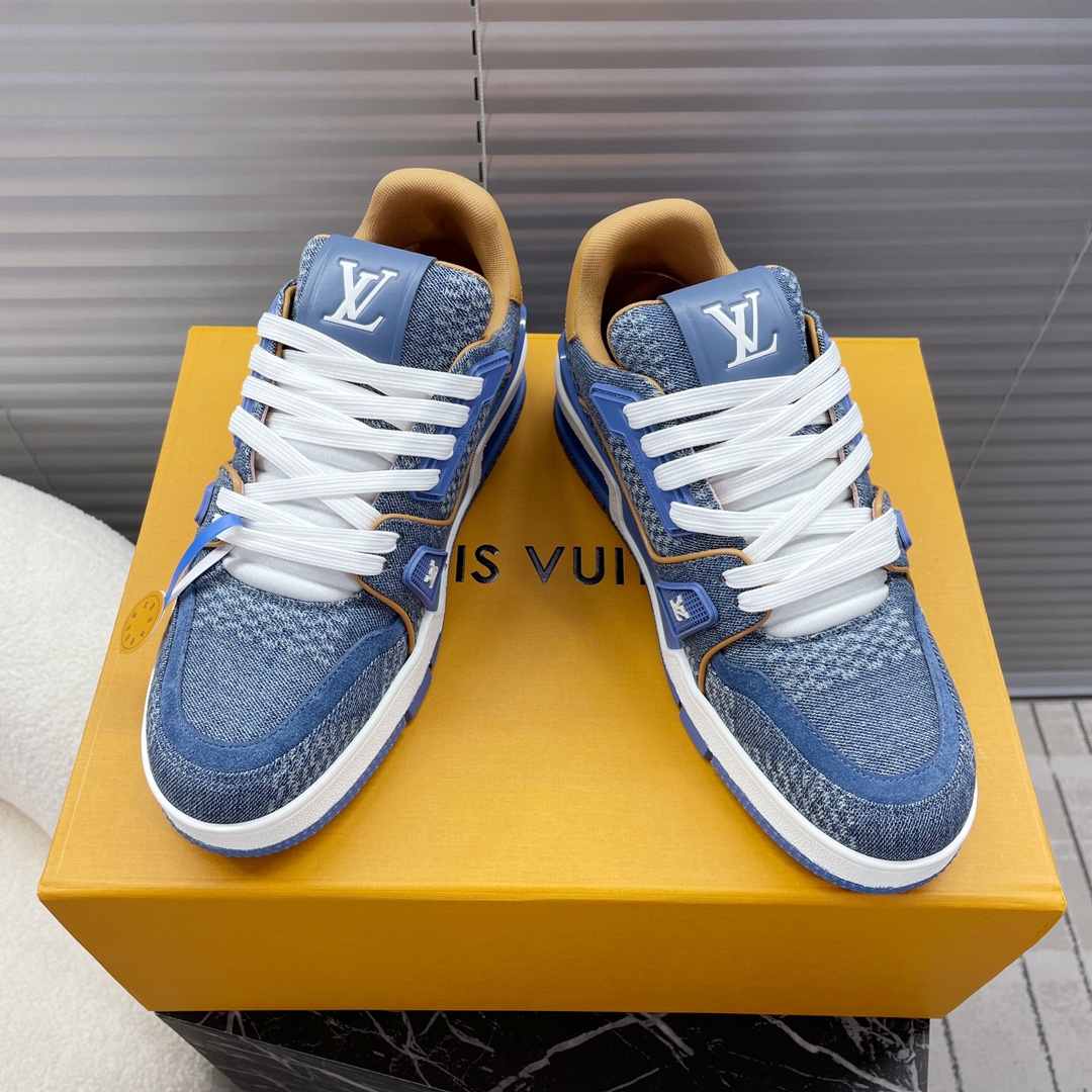 這款 LV 精品仿製藍色丹寧拼接運動鞋,以經典丹寧布結合皮革拼接,展現年輕且活力的街頭時尚感。鞋舌與鞋跟的 LV 標誌清晰醒目,搭配純白鞋帶與舒適鞋墊,穿著穩定而不失舒適感。丹寧藍色的層次設計使其成為百搭單品,無論搭配牛仔褲還是休閒短褲,都能打造隨性與高級感兼具的造型。此鞋款不僅外觀精緻,細節處理更顯品牌工藝,適合追求潮流品味的男士。