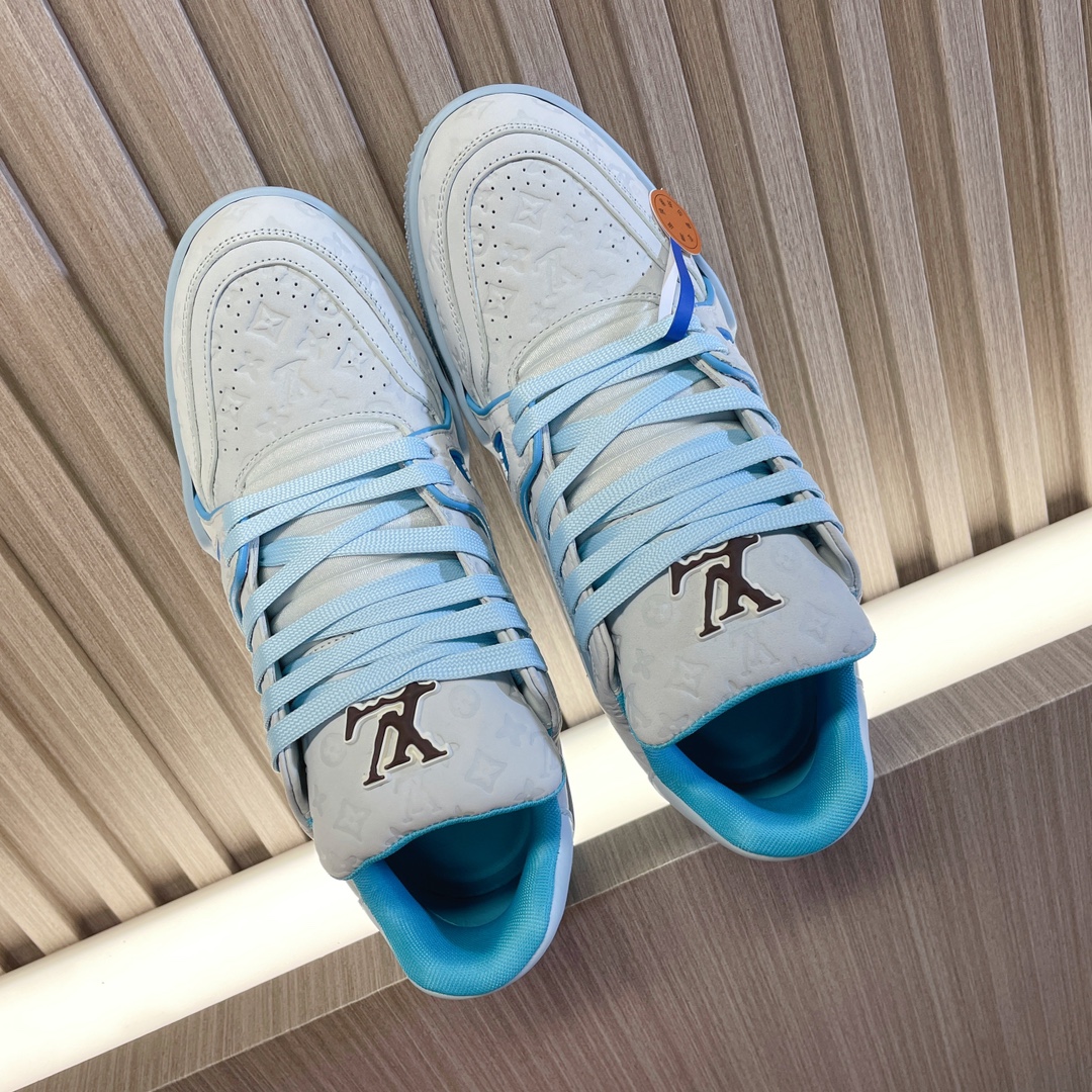 這款 LV 高仿淺藍色低筒運動鞋,以清爽的淺藍色調結合品牌經典 Monogram 壓紋,展現輕盈時尚感。鞋面採用優質材質,觸感柔軟並保持良好的透氣性,搭配同色系藍色鞋帶與細緻車縫工藝,細節呈現相當精緻。鞋舌上的 LV 標誌設計立體清晰,提升品牌辨識度。內襯舒適貼合,橡膠大底耐磨抓地力佳,無論日常出街或搭配休閒造型都能輕鬆駕馭,是一雙兼具舒適與時尚的百搭單品。