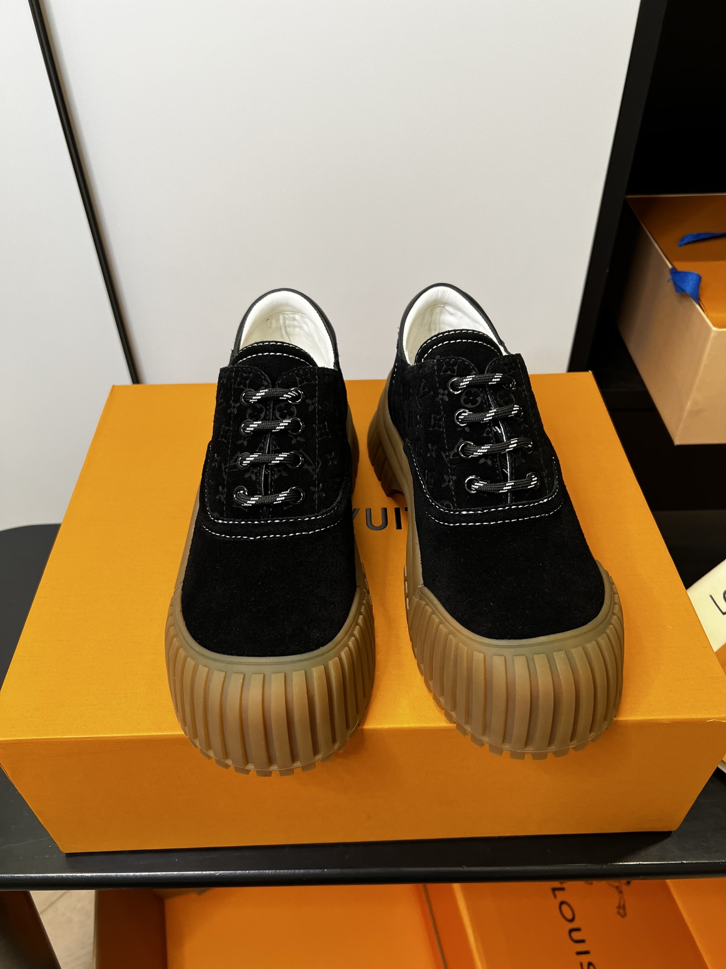 為您推薦最新一季LV高仿黑色麂皮拼接厚底休閒鞋,鞋身採用細膩麂皮與品牌Monogram帆布拼接設計,視覺層次感十足。鞋底採用防滑厚底膠材質,增高效果佳,穿著舒適不累腳。高仿工藝高度還原原版設計,無論是材質細節還是腳感皆出色,深受潮流人士與時尚達人喜愛,輕鬆打造百搭街頭風格。