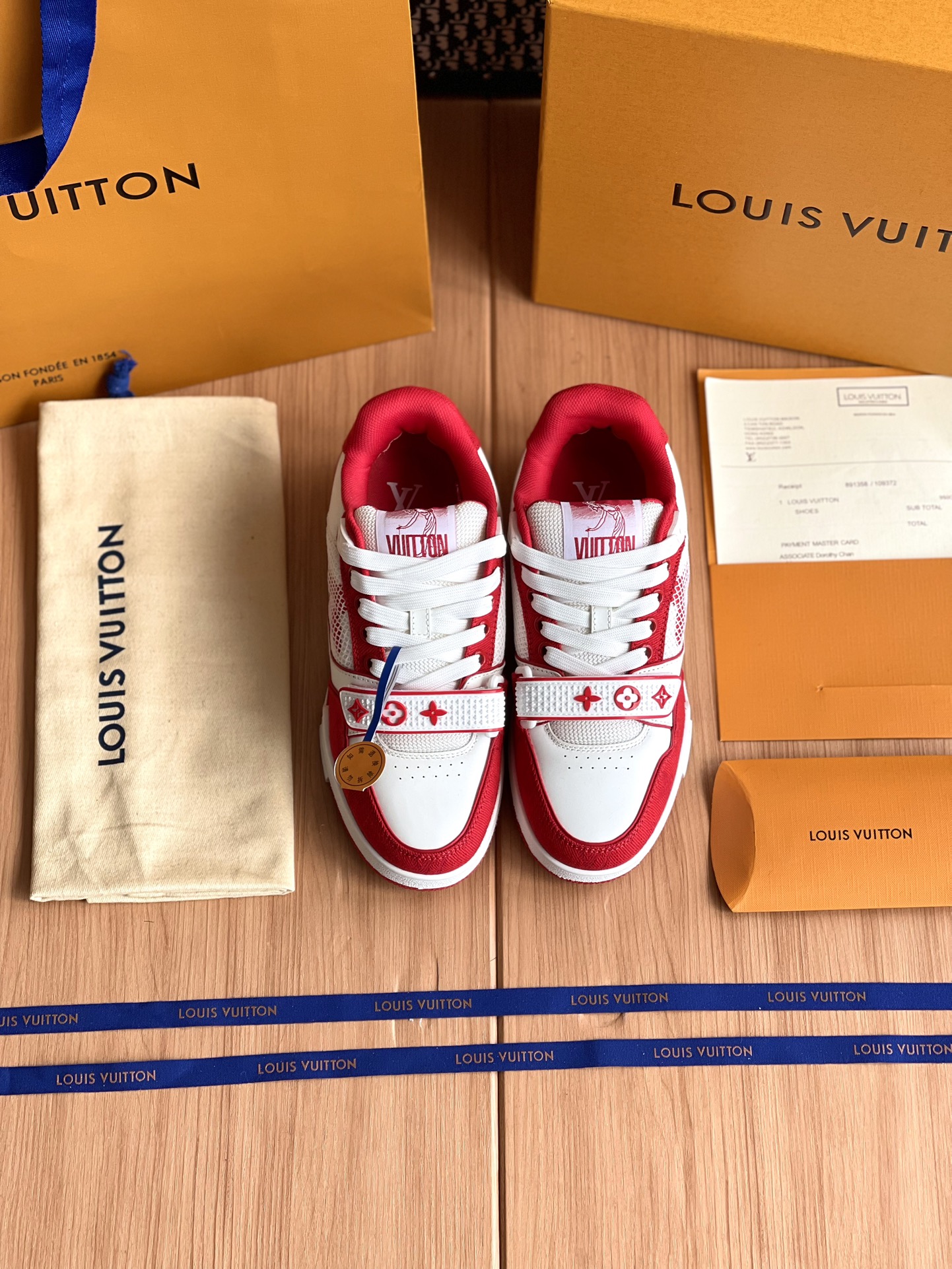 本商品為LV高仿紅色運動鞋,採用品牌經典LV Trainer版型,紅白撞色設計展現熱情活力。鞋面搭配Monogram經典圖紋與柔韌皮革材質,細節精緻,整體質感優越。高仿等級工藝還原正品標準,舒適內裡與耐磨大底,適合日常穿搭及街頭潮流造型。穿上它輕鬆打造個性時尚風格,展現自信魅力。