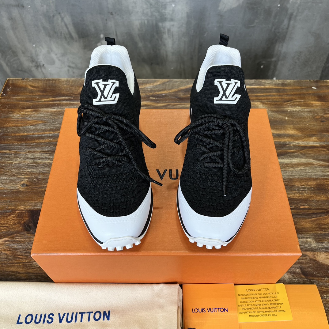 這雙LV高仿運動鞋以黑色針織面料結合純白皮革鞋頭設計,打造出強烈對比又不失和諧的視覺效果。鞋面輕盈透氣,鞋頭與後跟加固處理提升穩定性與耐穿度。LV標誌大方展示於鞋舌上,極具辨識度與品牌感。無論日常出街或輕運動穿著皆合適,是注重細節與質感的你不可錯過的選擇。