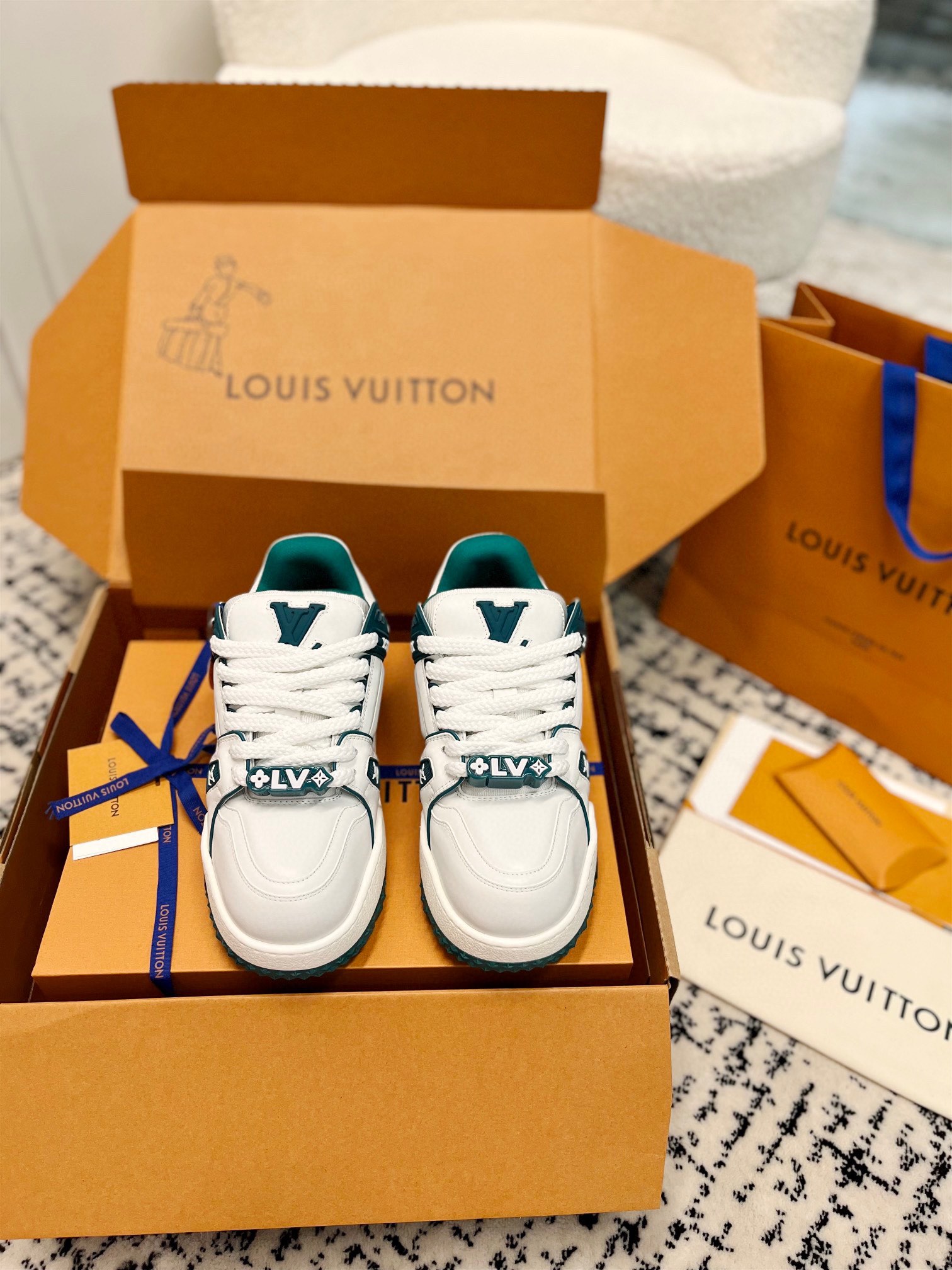 這款LV高仿白綠運動鞋以純白鞋身搭配深綠色點綴,營造沉穩內斂又帶有運動感的時尚風格。鞋舌與鞋帶扣上的LV刺繡與Monogram花紋細節,細緻做工讓整體質感更上一層。鞋底採用加厚耐磨設計,行走穩定舒適,無論是日常通勤還是假日出遊都非常適合。整體造型低調百搭,輕鬆駕馭街頭、運動與休閒風格,展現獨特個人魅力。