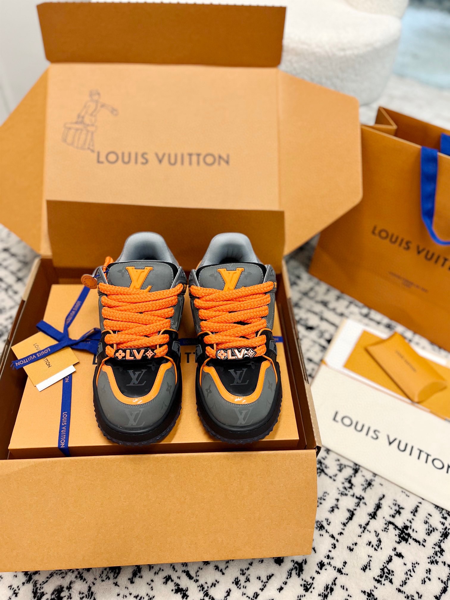 這款LV高仿灰橘運動鞋以深灰皮革為基底,搭配亮眼橘色細節與鞋帶,打造強烈視覺衝擊,展現街頭潮流氣息。鞋面飾有低調壓印LV圖樣與標誌性Monogram元素,層次感豐富。橘色粗繩鞋帶增添個性,厚底設計提供穩定支撐與出色緩震力,適合長時間穿著。這雙運動鞋無論搭配牛仔褲、運動褲或工裝褲都能穿出時尚態度,是走在潮流前線的男士必備單品。