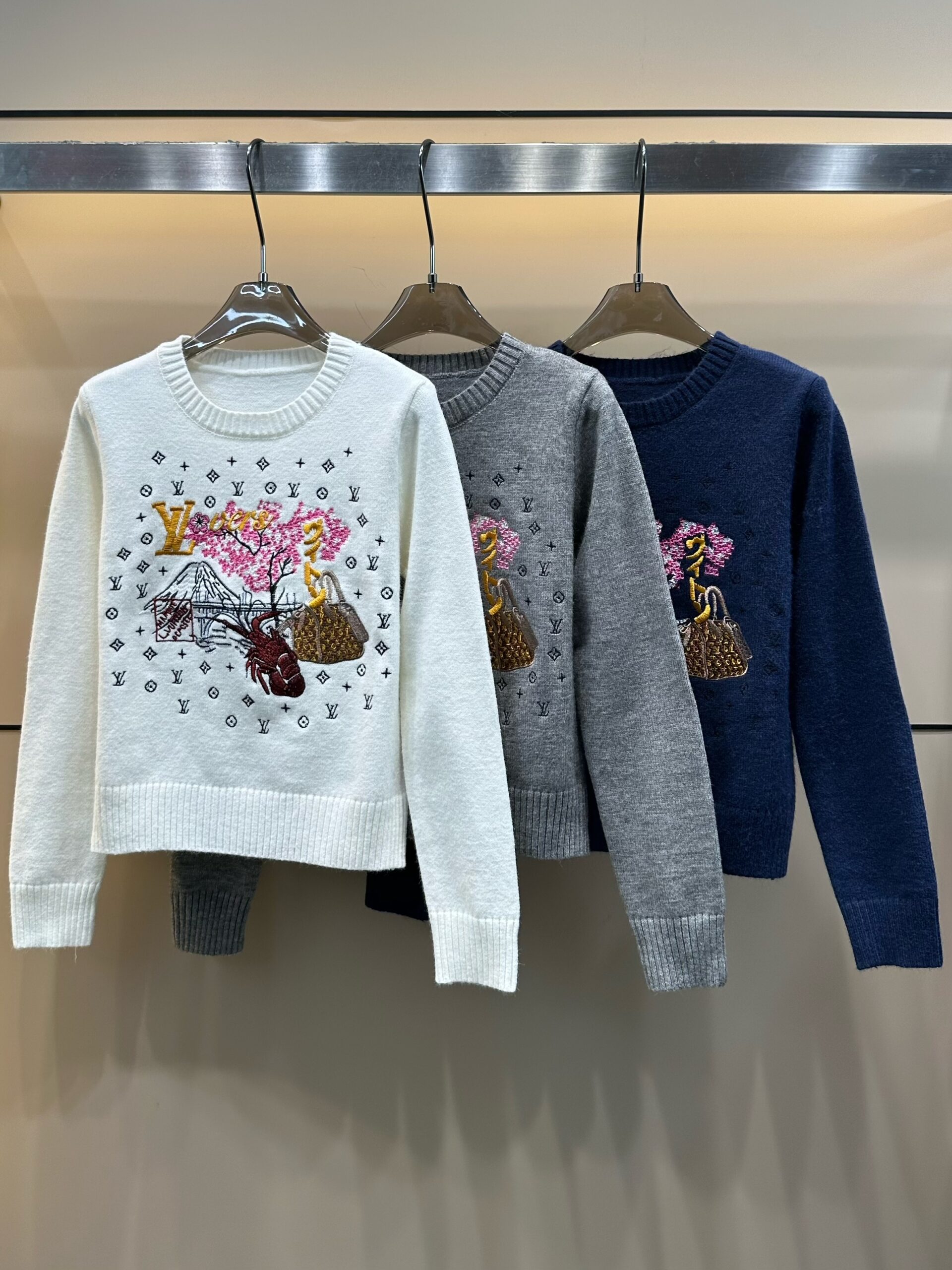 這款 LV 原單刺繡毛衣,以純白色羊毛混紡面料打造,觸感柔軟舒適,正面融入櫻花、行李箱與經典包款的刺繡細節,營造充滿藝術感的時尚氛圍。圓領版型簡約百搭,搭配牛仔褲或半身裙即可展現優雅氣質。多位顧客分享穿著體驗:「刺繡精緻細膩,與專櫃無差別,實穿又不失高級感。」