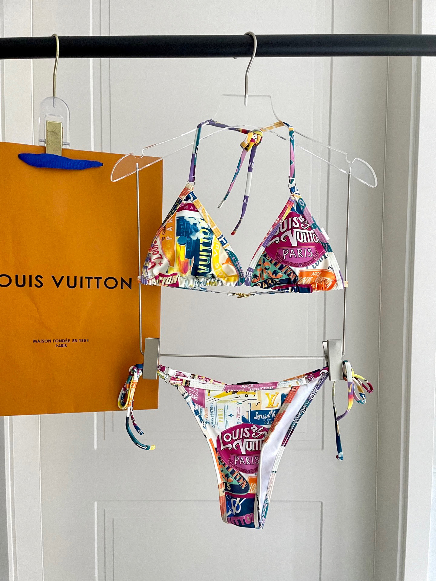 這款 LV 一比一比基尼套裝,以旅遊印花拼貼為主題,色彩繽紛且充滿藝術感,為夏日海灘注入時尚活力。三角杯設計搭配可調式綁帶,能依身形自由調整,貼合舒適,凸顯迷人曲線。下身側邊蝴蝶結綁帶設計增添俏皮感,同時修飾腰線比例。整體採對標原版工藝製作,質感細膩,適合海灘度假、泳池派對或度假村穿搭,展現大膽性感的夏日風格。