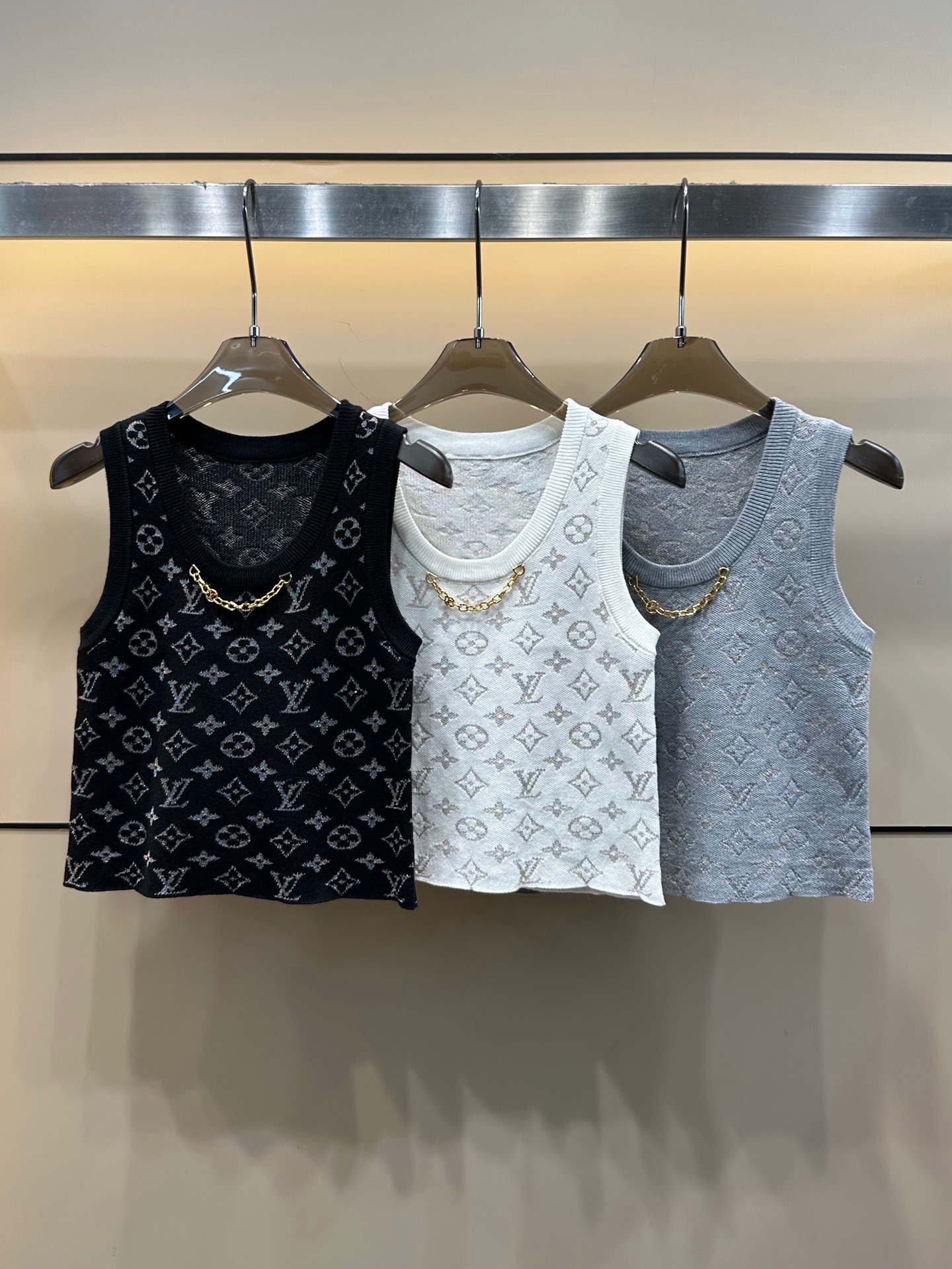 這款 LV 精品仿製針織背心以清新的白色為基調,滿版經典字母花紋,細膩的編織工藝凸顯質感。領口以金屬鏈條裝飾,增添摩登時尚氣息,讓簡約設計更具層次感。採用舒適親膚材質,穿著輕盈透氣,無論單穿或搭配襯衫、外套,都能展現優雅與潮流兼具的造型。顧客回饋:「版型俐落,細節精緻,搭配褲裝或裙裝都很百搭。」