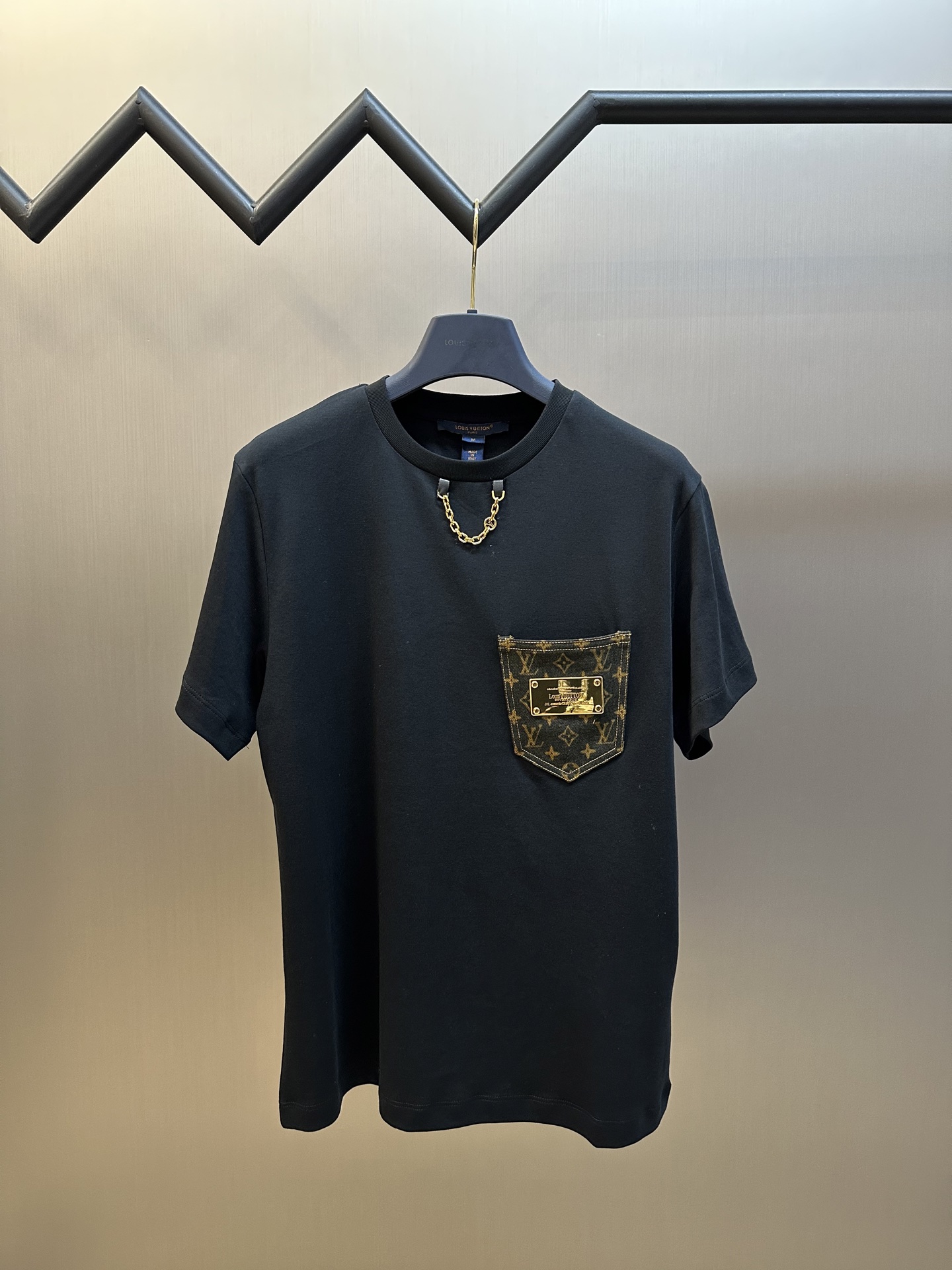 這款LV一比一黑色短袖T恤,以極簡黑色為基調,胸前設計經典老花口袋,搭配金屬牌裝飾,低調又凸顯品牌質感。領口處增添金屬鏈條點綴,打破純色單調,彰顯街頭時尚與高級氛圍。面料選用高品質純棉,柔軟親膚,舒適透氣,版型挺括有型,適合日常穿著或時尚出行。這款T恤可單穿搭配牛仔褲,也能作為疊搭內搭,隨性展現高級品味。 商品說明:
