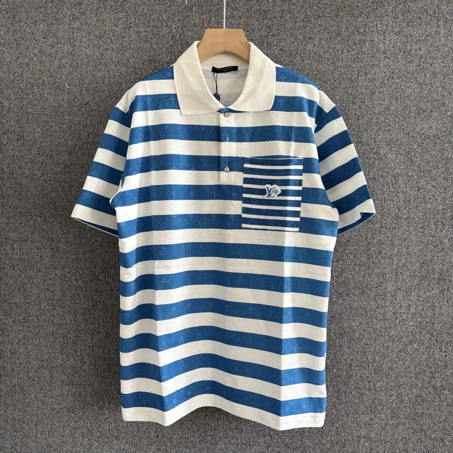 為您推薦最新一季潮流單品,設計時尚、實用性高。這款LV原單男士條紋POLO衫,採用經典藍白條紋設計,胸前拼接口袋點綴LV心形Logo,增添細節巧思。面料柔軟透氣,親膚舒適,適合夏日穿著。立領設計搭配精緻鈕扣,整體線條俐落,展現優雅與活力兼具的氣質。