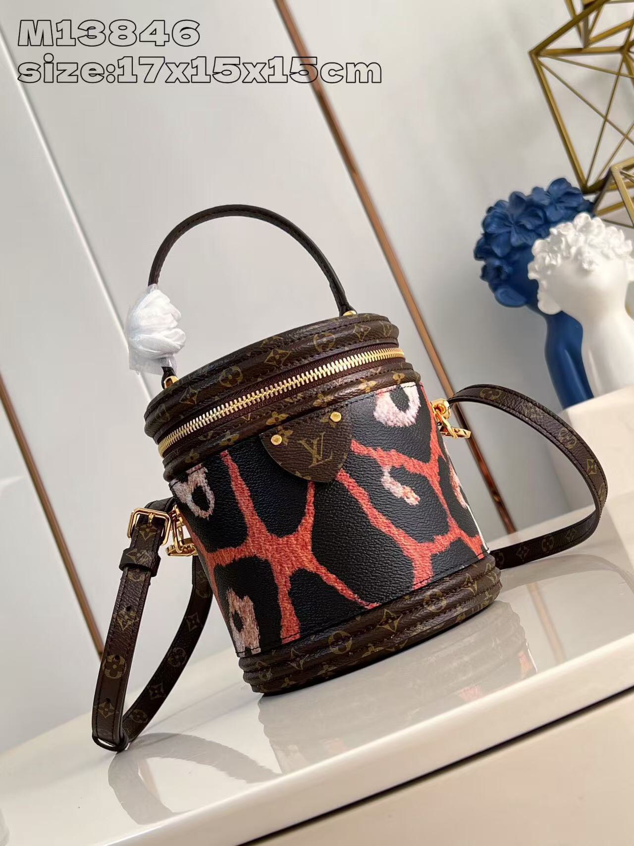 Louis Vuitton M13846 採用經典Monogram帆布與野性動物紋圖騰拼接,打造出這款圓桶造型手提斜背包,尺寸為17x15x15cm,立體收納空間便利實用。包身細節如黃銅色拉鍊、LOGO皮牌、可調式肩背帶等均精準還原原廠比例與工藝,是頂級一比一原單復刻款。無論是作為化妝收納、日常外出或展現個人風格都極具吸睛效果,展現獨特時尚品味。