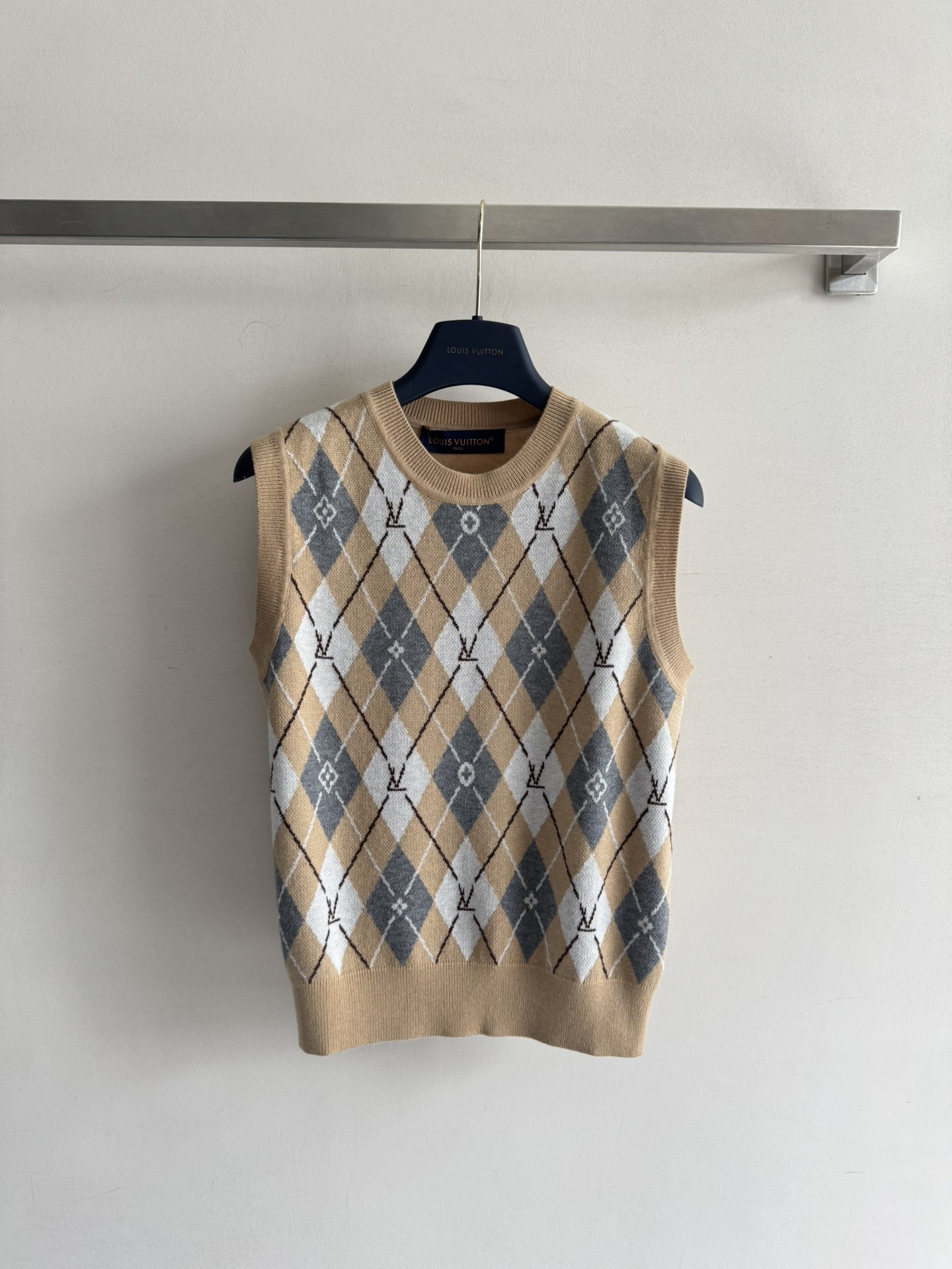 開箱即有驚喜感,配件與主體呈現一致性極高。此款 LV 精品仿製針織背心採用溫潤米杏色調與品牌經典菱格圖騰設計,展現低調中的高級質感。材質柔軟不刺膚,單穿或疊搭襯衫皆能提升造型層次感,為春秋必備人氣單品。