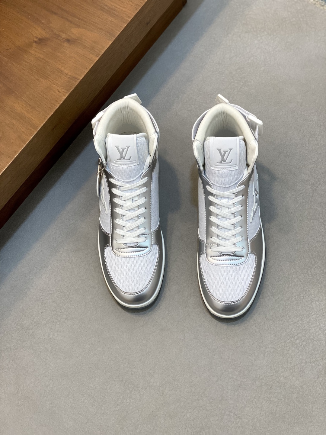 這款 LV 原單高筒運動鞋以純白配色結合銀色金屬質感拼接,展現極簡又前衛的風格。鞋面使用透氣材質搭配皮革設計,確保穿著舒適的同時,帶來高級質感。高筒設計有效支撐腳踝,日常出街、運動或搭配休閒服裝都能輕鬆駕馭。買家普遍反饋這款精品仿製鞋款不僅外觀逼真,還原度極高,穿著起來穩固耐穿,時尚感十足。
