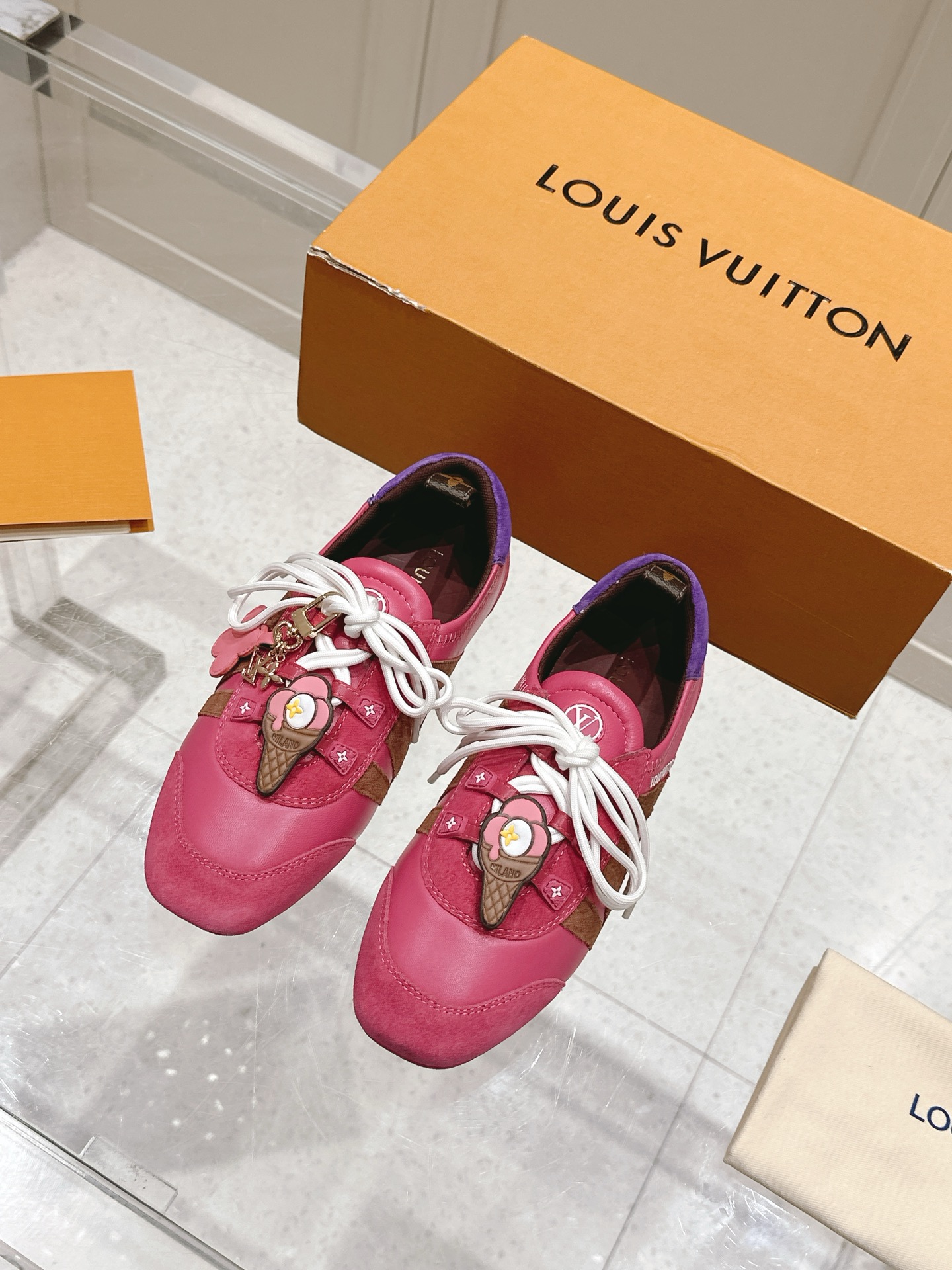 這款LV玫紅色芭蕾運動鞋色澤飽滿亮眼,鞋面採細緻柔軟的仿皮與布料拼接設計,符合女性腳型,穿起來輕盈柔軟。屬於Sneakerina系列中最甜美的風格代表,適合春夏出遊、日常穿搭,甜美又有型。